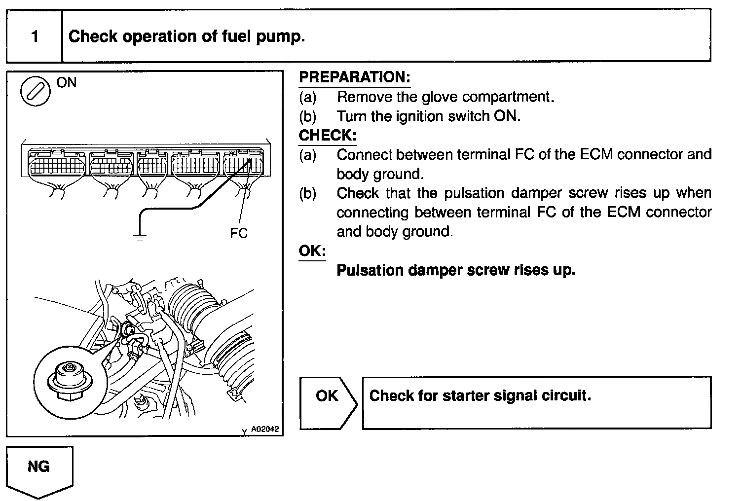 While the NE signal is generated (engine running), the ECM keeps Tr ON (circuit opening relay ON) and the fuel pump also keeps operating.