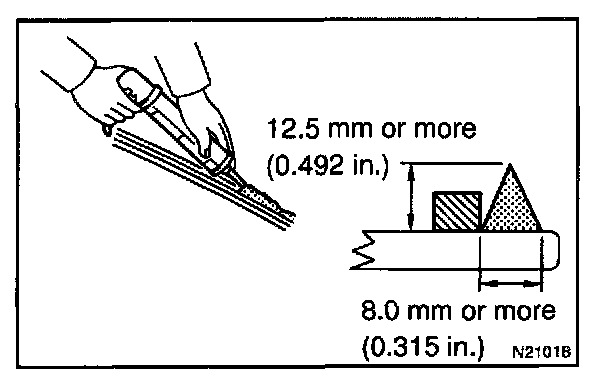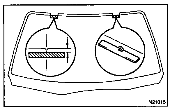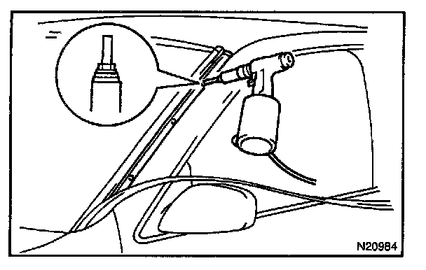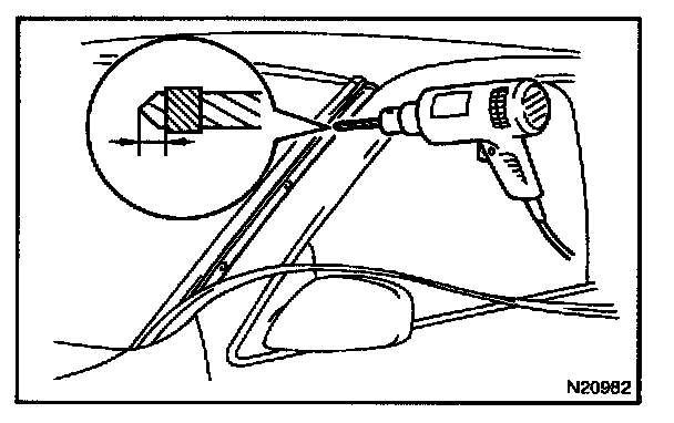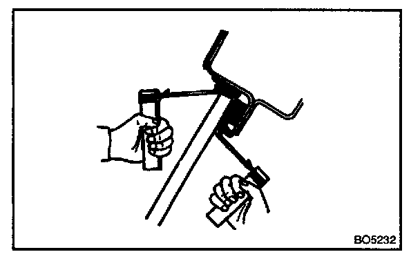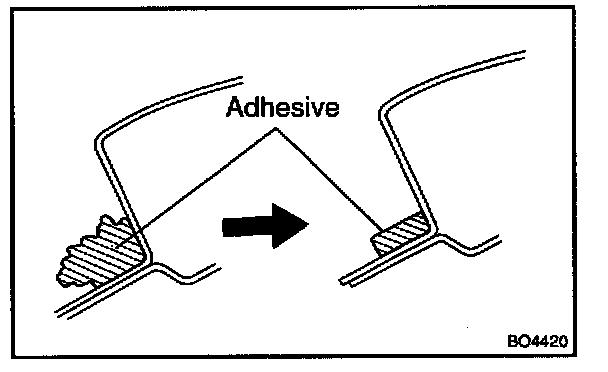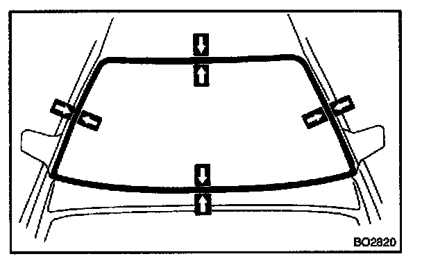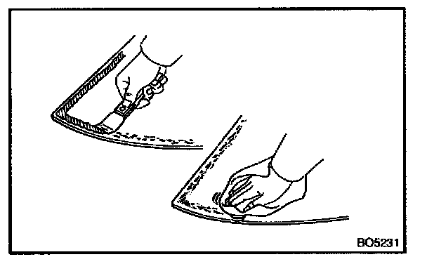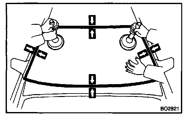 NOTE: When separating the glass, be careful not to damage the paint and interior and exterior ornaments. To prevent scratching the safety pad when removing the windshield, place a plastic sheet between the piano wire and safety pad.