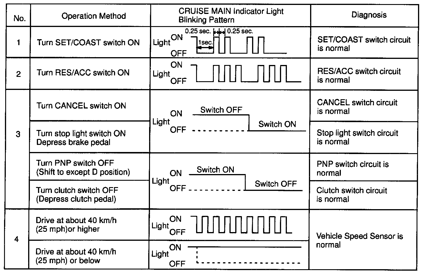 f. Read the blinking pattern of the CRUISE MAIN indicator light.