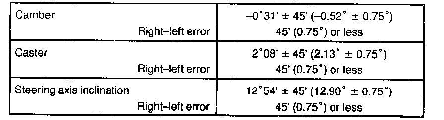 If the caster and steering axis inclination are not within the specified values, after the camber has been correctly adjusted, recheck the suspension parts for damaged and/or worn out parts.