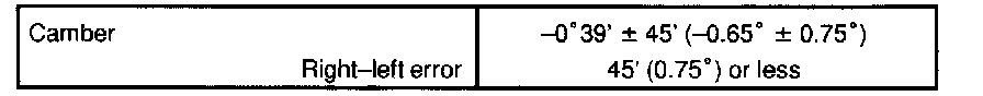If the measured value is not within the specified value, inspect the suspension parts for damage and/or wear and replace them if necessary because camber is not adjustable.