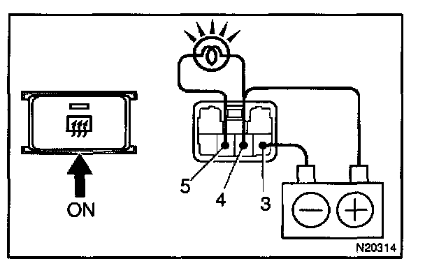 c. Push the defogger switch ON, check that the indicator light and test bulb light up for 12 to 18 minutes, then the indicator light and test bulb light goes out.