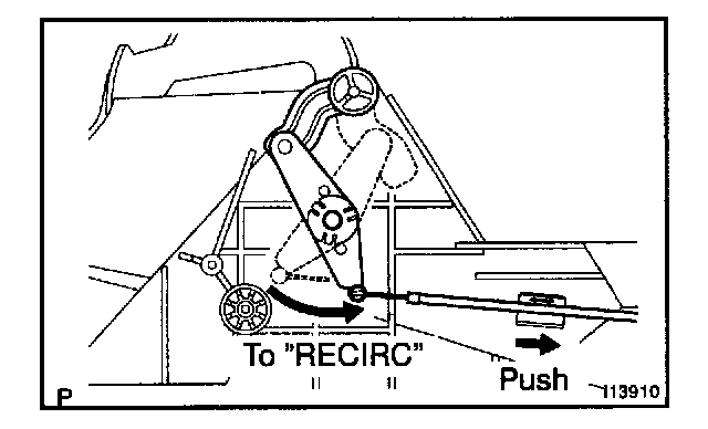 Set air inlet damper control lever to "RECIRC" position and connect the inner cable to lever pin and clamp the outer cable.