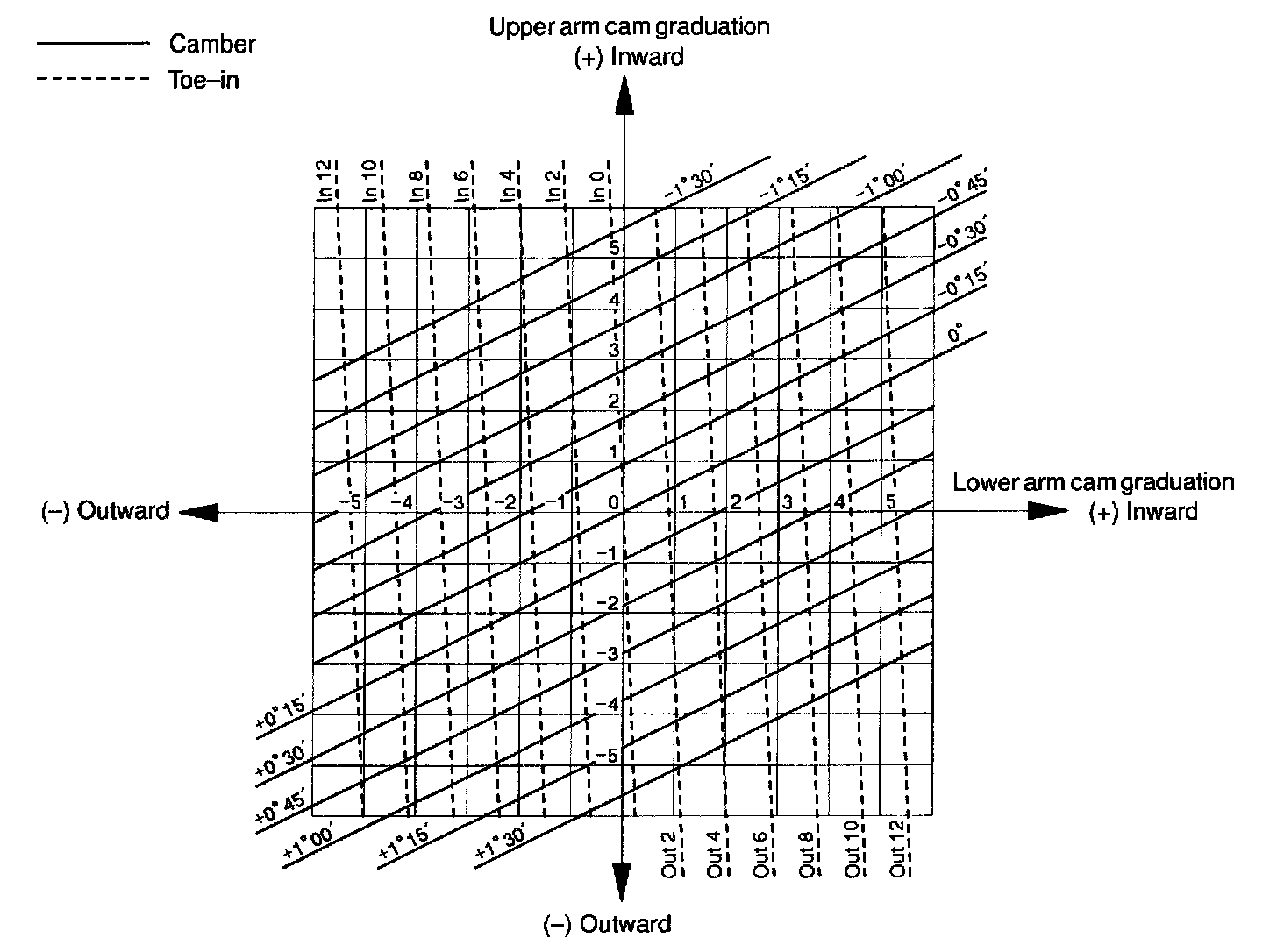 c. As shown in the example chart, read the distance from the marked point to the origin of the chart, and adjust the upper and/or lower arm adjusting cams accordingly