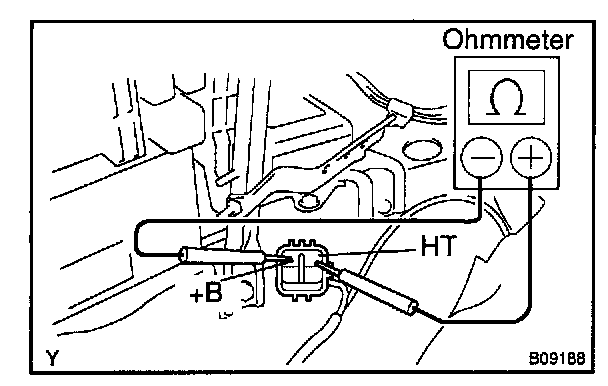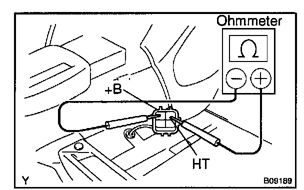 b. Using an ohmmeter, measure the resistance between the terminals +B and HT.