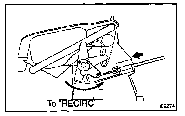 Set air inlet damper control lever to "RECIRC" position and connect the inner cable to lever pin and clamp the outer cable.