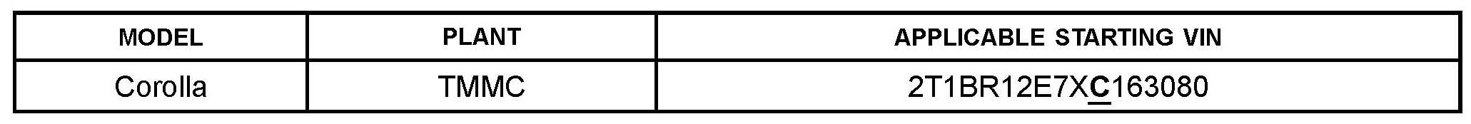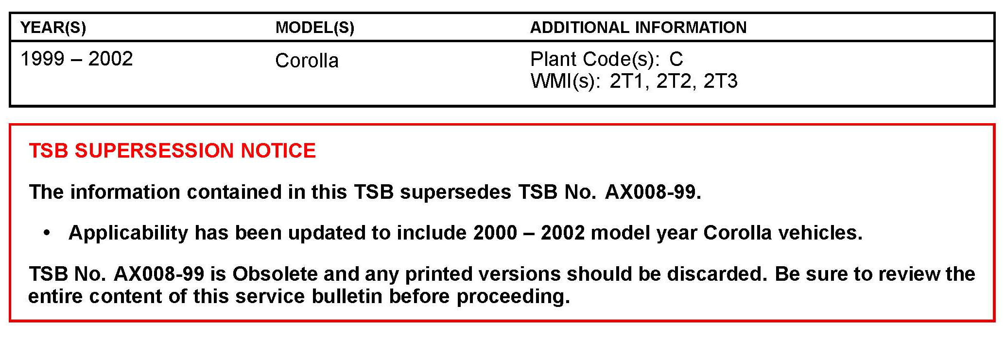 This TSB applies to 1999 - 2002 Corolla vehicles with plant code "C" in the VIN (7th digit from the right) starting with the VIN shown below.
