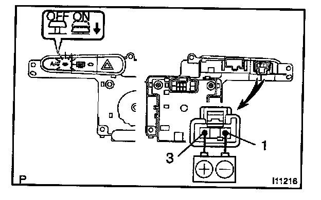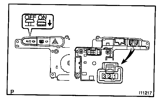 Connect the positive (+) lead from the battery to terminal 3 and negative (-) lead to terminal 1, then check that the A/C indicator lights up while A/C switch is pressed.