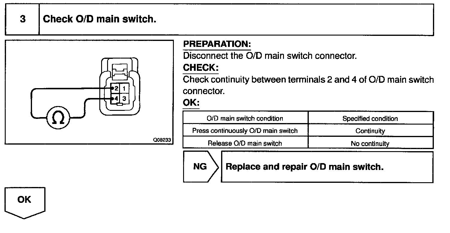 CIRCUIT DESCRIPTIONThe O/D main switch is a momentary type switch. When pressing the O/D main switch, the O/D OFF indicator light lights up and ECM prohibits shifting to O/D, and when pressing it again, the O/D OFF indicator light goes off and ECM allows shifting to O/D. Turning the IG switch OFF will reset the O/D OFF indicator light.