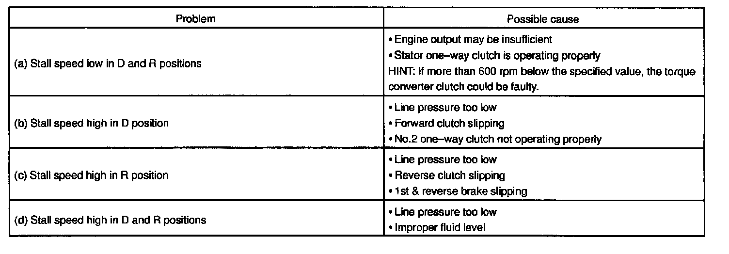 The object of this test is to check the overall performance of the transaxle and engine by measuring the stall speeds in the D and R positions.