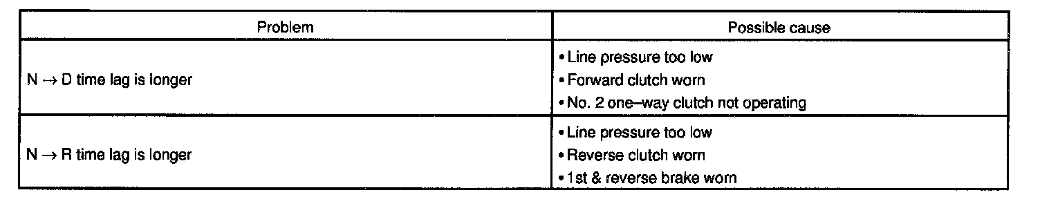 When the shift lever is shifted while the engine is idling, there will be a certain time lapse or lag before the shock can be felt. This is used for checking the condition of the No.2 one-way clutch, reverse clutch, forward clutch, and 1st & reverse brake.