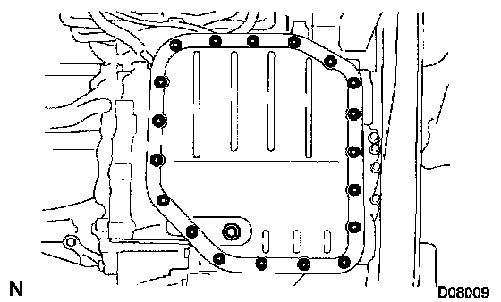 Remove the 19 bolts, and carefully remove the oil pan assembly. Discard the gasket.