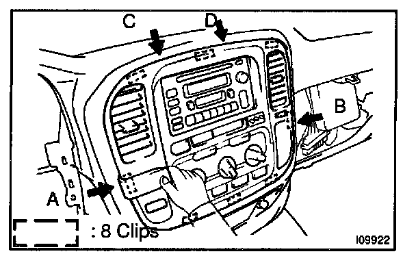 a. Using a moulding remover, remove the center cluster in order "A", "B", "C", "D", as shown in the illustration.