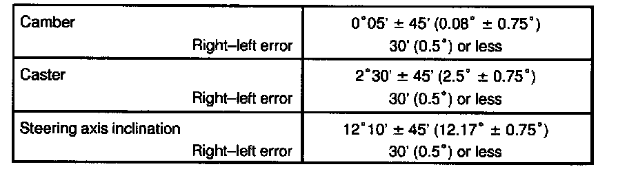 If the steering axis inclination is not within the specified value, after the camber and caster have been correctly adjusted, recheck the steering knuckle and front wheel for bearing or looseness.