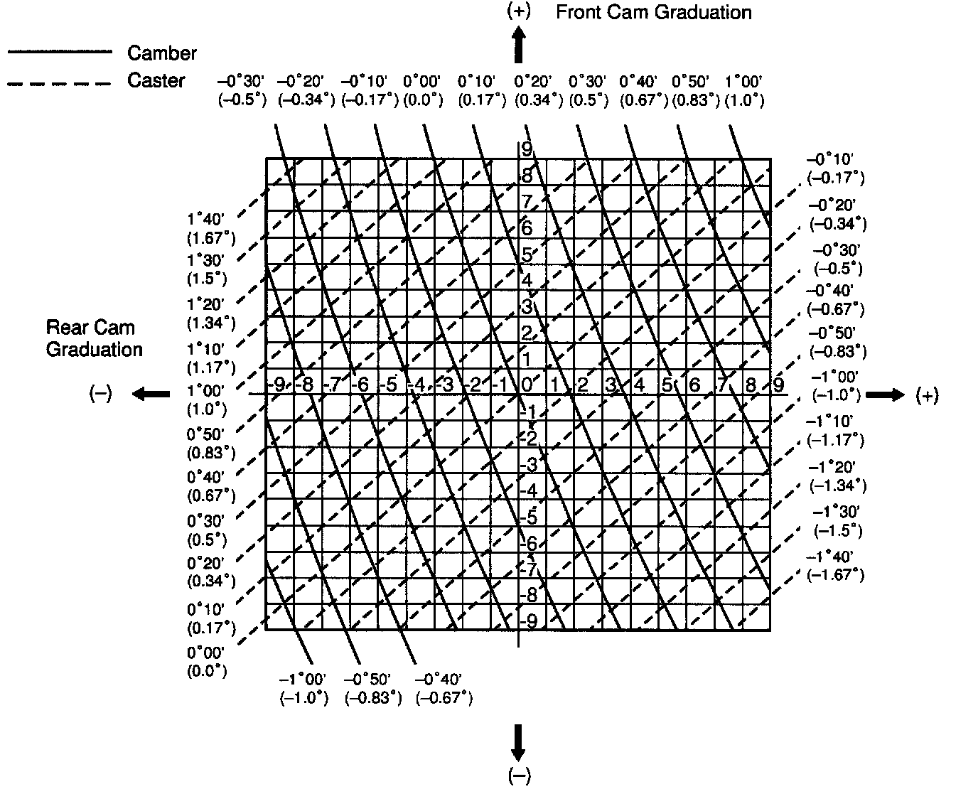 3. As shown in the chart, read the distances from the marked point to 0 point, and adjust the front and/or rear adjusting cams accordingly.