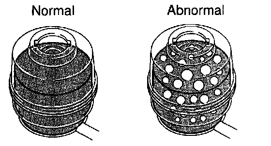 e. Check for foaming or emulsification. If there is foaming or emulsification, bleed power steering system.