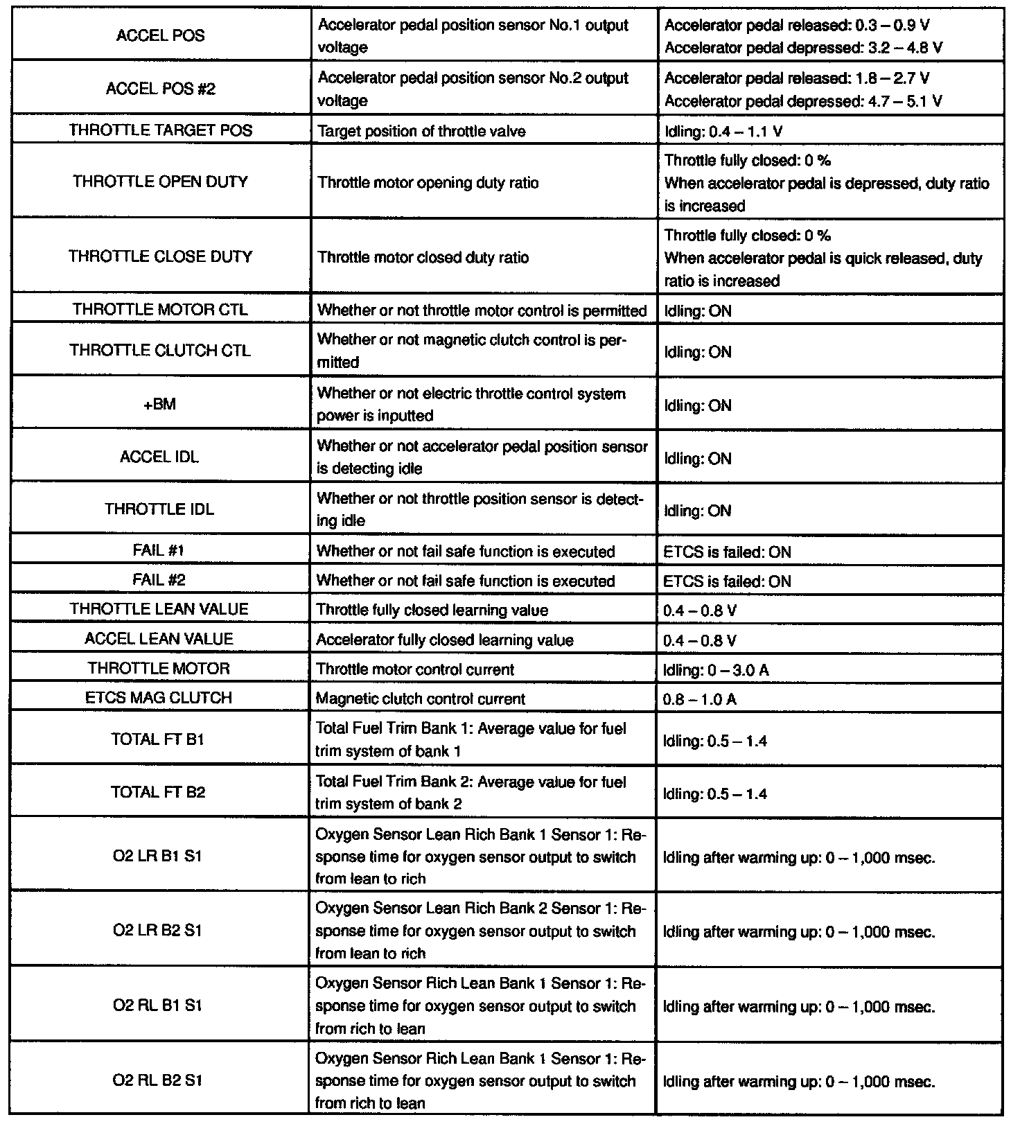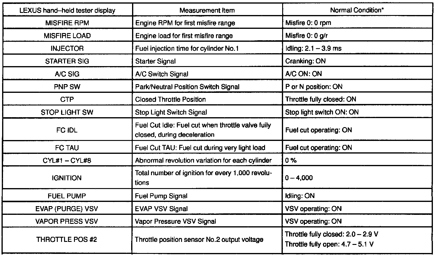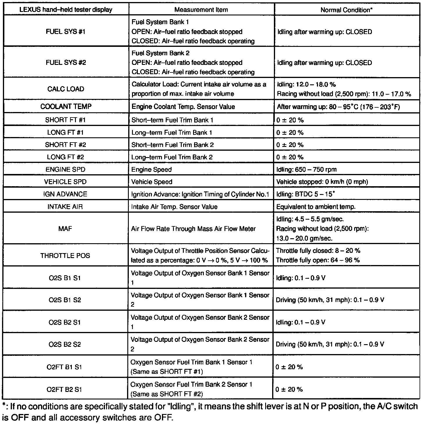 *: If no conditions are specifically stated for "Idling", it means the shift lever is at N or P position, the A/C switch is OFF and all accessory switches are OFF.