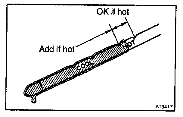 5. With the engine idling, check the fluid level. Add fluid up to the COOL level on the dipstick.