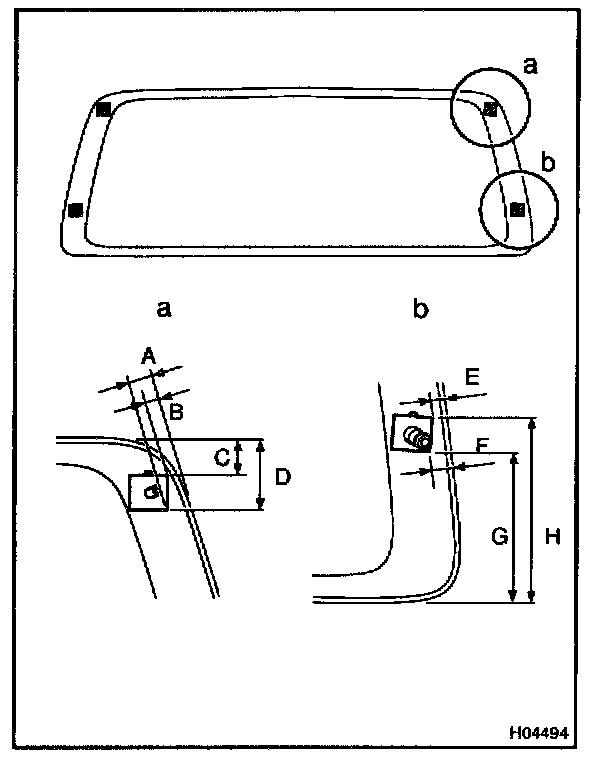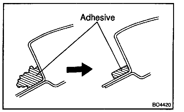 b. Hold back window glass in place securely with protective tape or equivalent until the adhesive hardens.