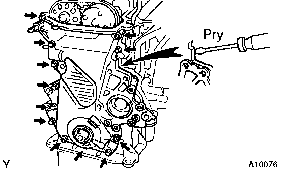 b) Using a screwdriver, pry between the timing chain cover and cylinder head or cylinder block.
