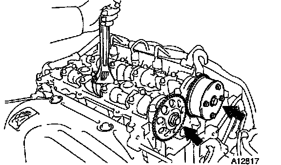 a) Hold the hexagonal head wrench portion of the camshaft with a wrench, and loosen the sprocket.