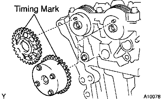 b) Check that the point marks of the camshaft timing sprocket and VVT timing sprocket are in straight line on the timing chain cover surface as shown in the illustration.
