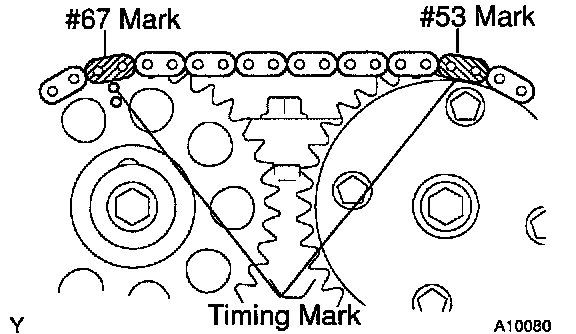b) Install the timing chain on the camshaft timing sprocket and VVT timing sprocket with the #53 and #67 mark links aligned with the timing marks on the camshaft timing sprocket and VVT timing sprocket.