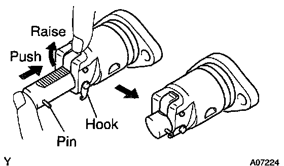 a) Release the ratchet pawl, fully push in the plunger and apply the hook to the pin so that the plunger cannot spring out.
