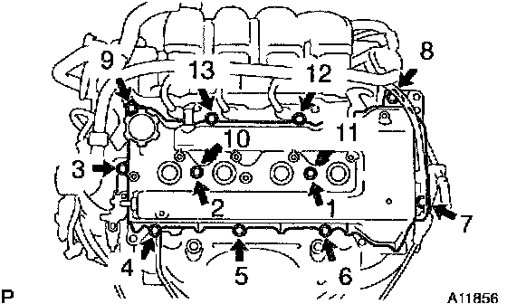d) Install the cylinder head cover and engine wire bracket with the 9 bolts, 2 seal washers and 2 nuts. Uniformly tighten the bolts and nuts in the several passes, in the sequence shown.