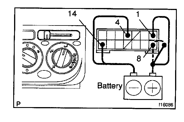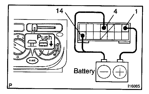 a. Connect the positive (+) lead from the battery to terminal 1 and the negative (-) lead to terminals 4 and 14 while pressing the switch.