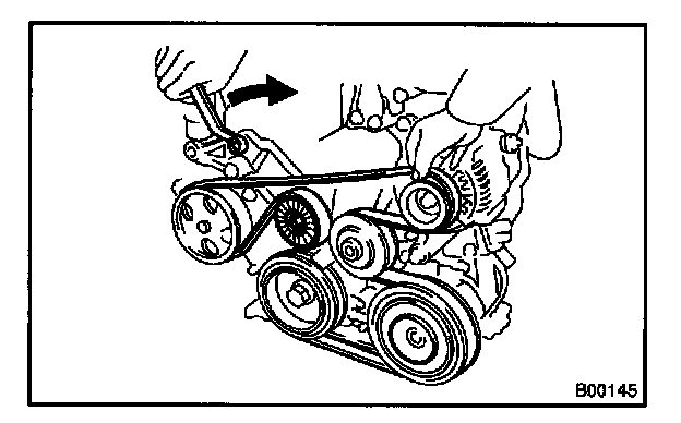 Loosen the drive belt tension by turning the drive belt tensioner arm clockwise, and remove the drive belt.
