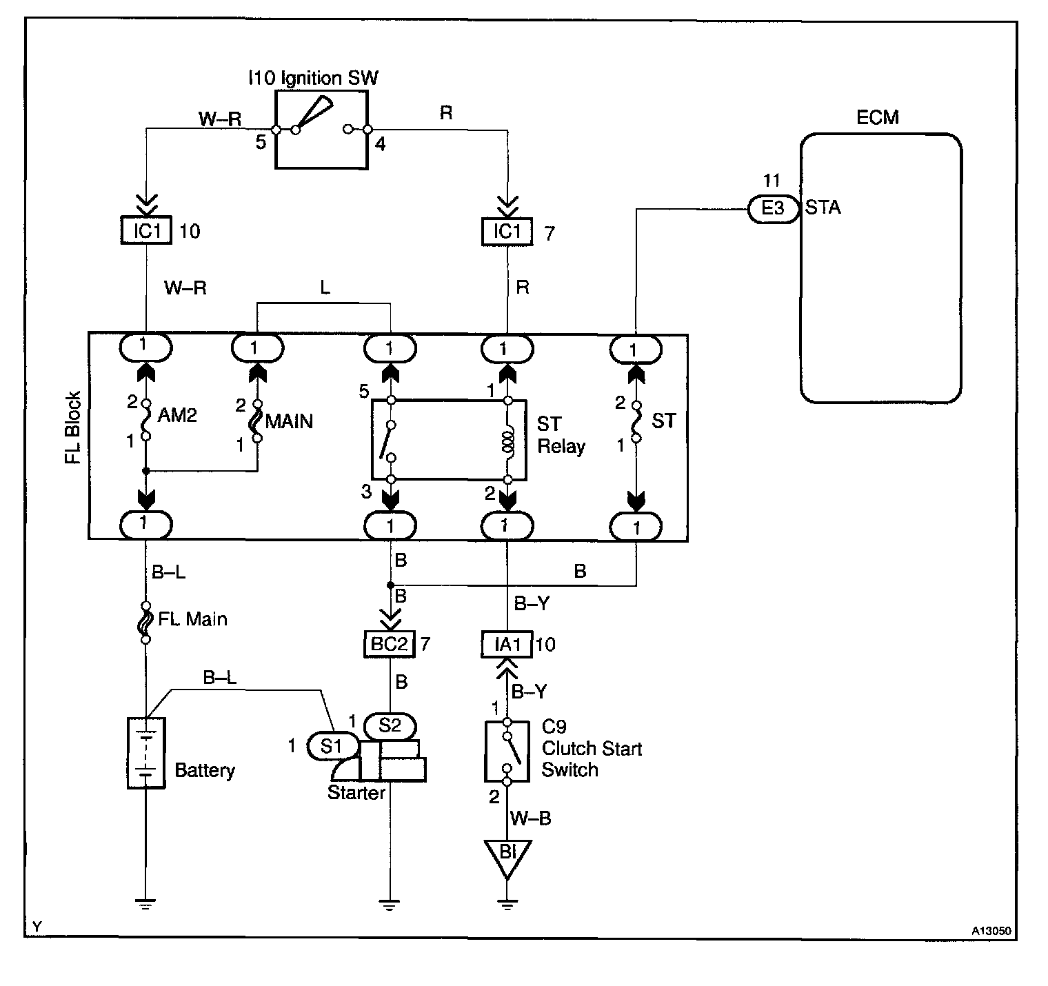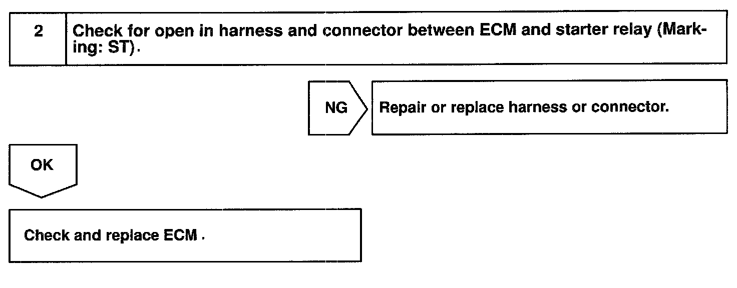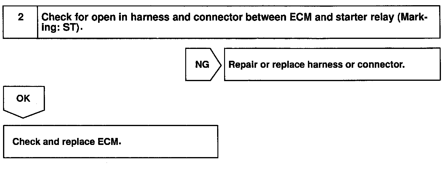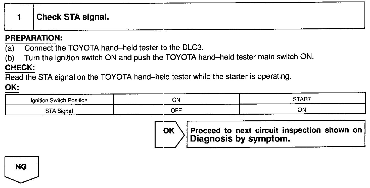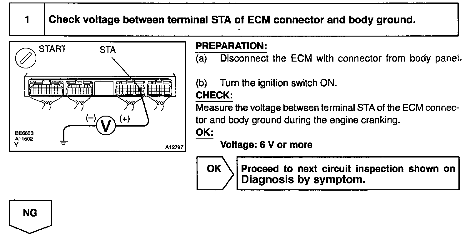 CIRCUIT DESCRIPTIONWhen the engine is cranked, the intake air flow is slow, so fuel vaporization is poor. A rich mixture is therefore necessary in order to achieve good startability. While the engine is being cranked, the battery voltage is applied to terminal STA of the ECM. The starter signal is mainly used to increase the fuel injection volume for the starting injection control and after-start injection control.