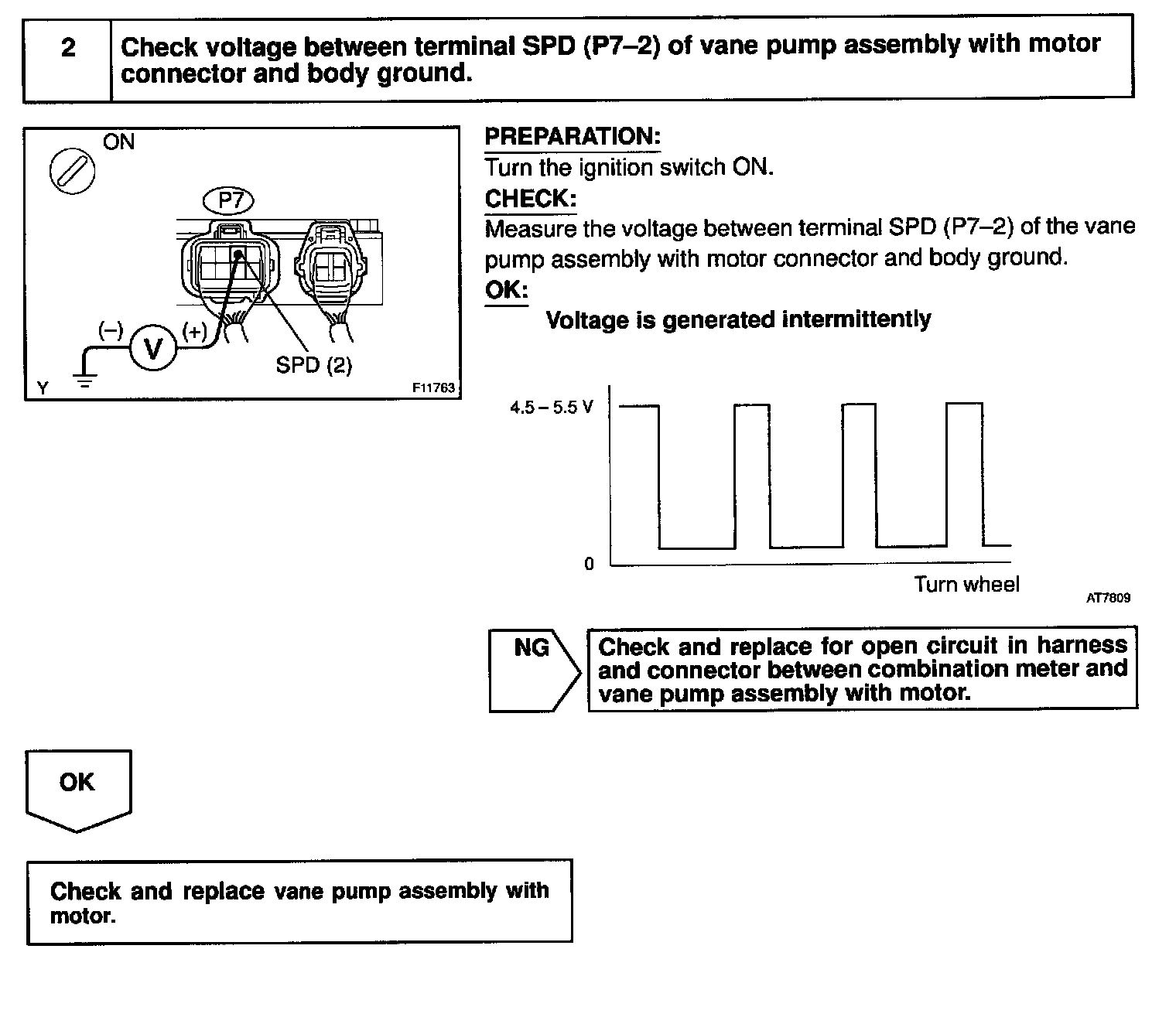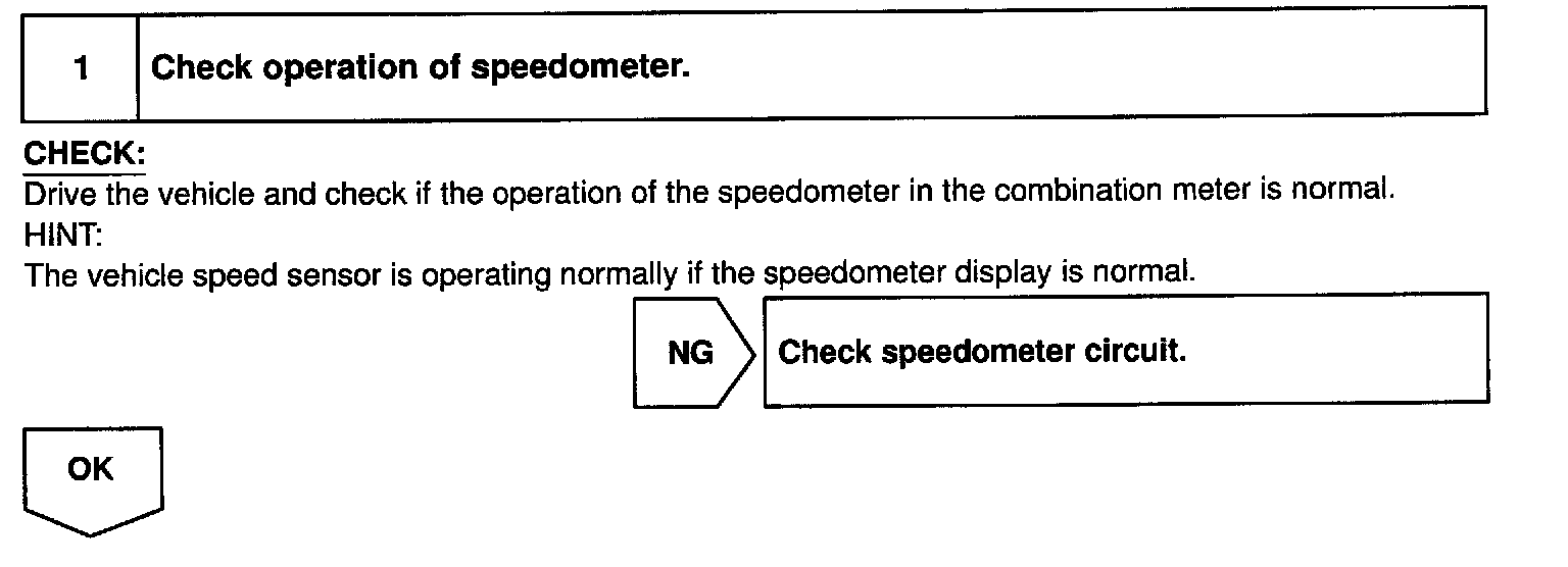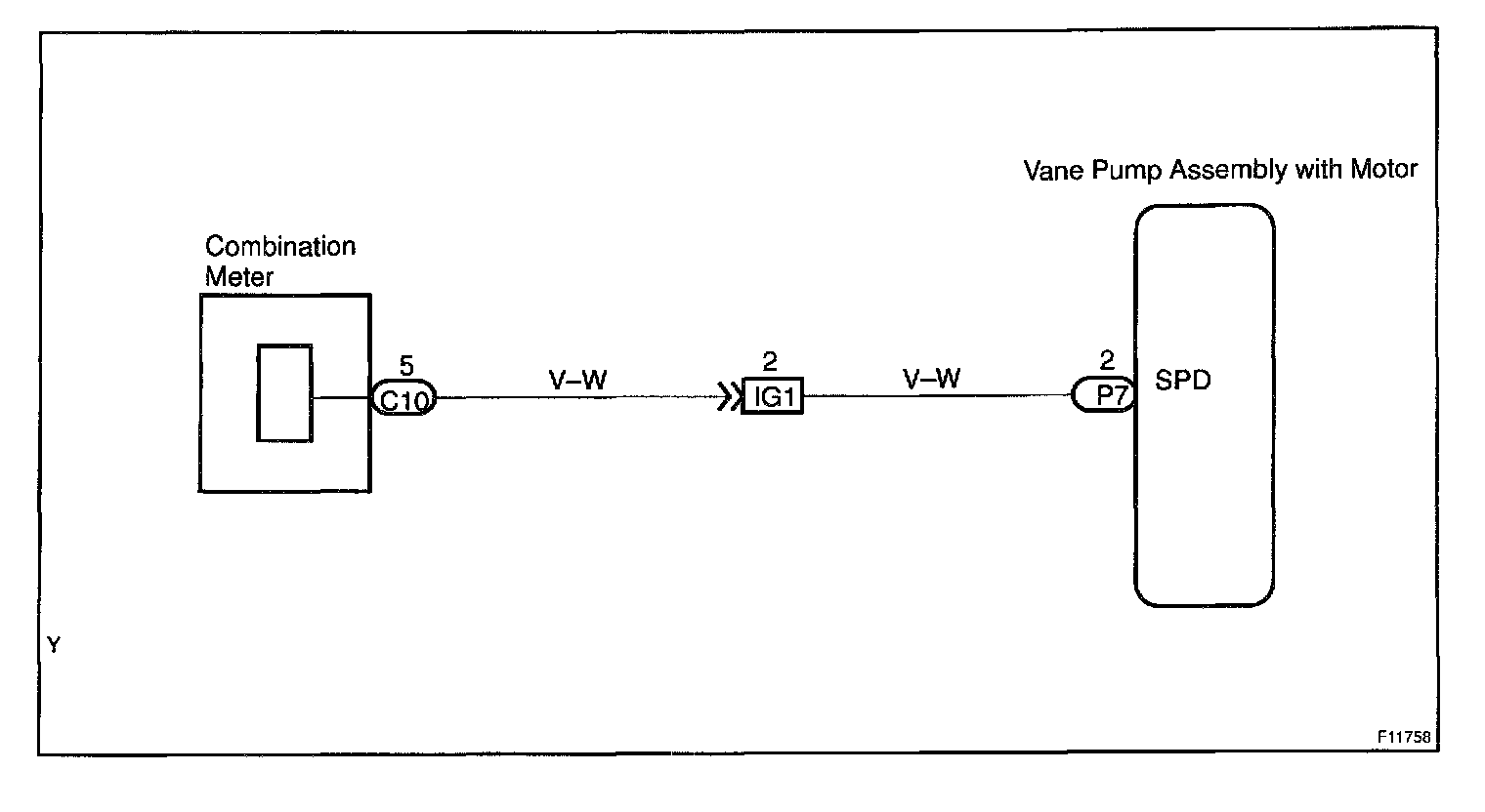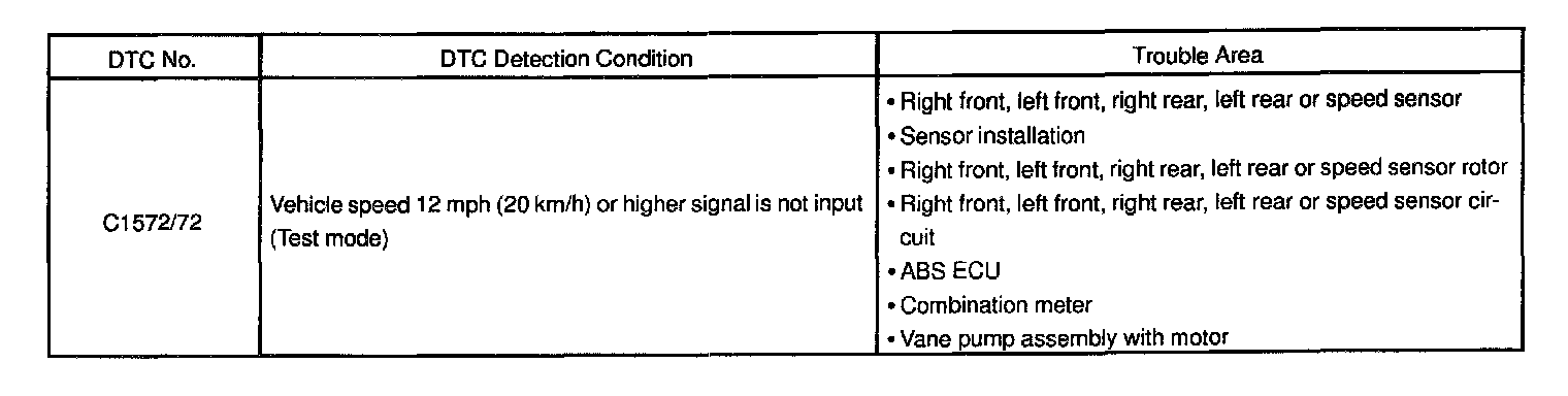 The speed sensor for ABS detects the wheel speed and sends the appropriate signals to the ABS ECU. The ECU converts these signals into a 4-pulse signal and outputs it to the combination meter. After this signal is converted into a more precise rectangular waveform by the waveform shaping circuit inside the combination meter, it is then transmitted to the vane pump assembly with motor. The vane pump assembly with motor determines the vehicle speed based on the frequency of these pulse signals.