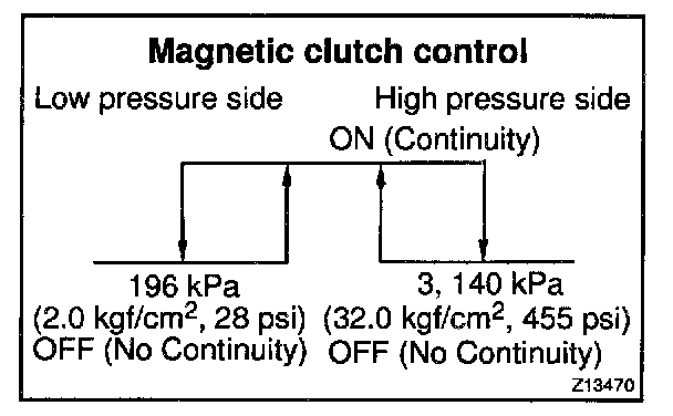 b. Check continuity between terminals when refrigerant pressure is changed, as shown in the illustration.
