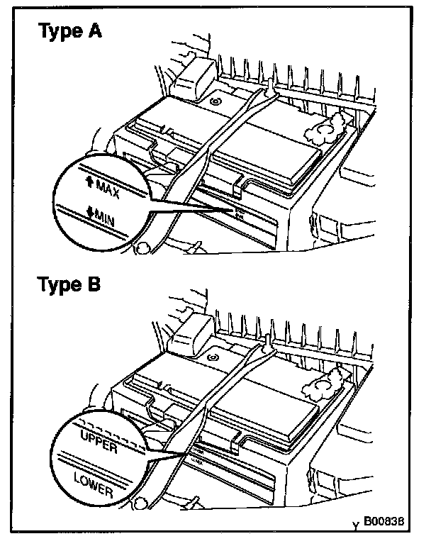 If under the MAX (LOWER) level, replace the battery (or add distilled water if possible). Check the charging system.