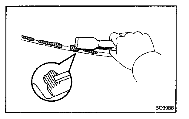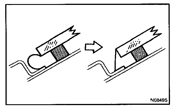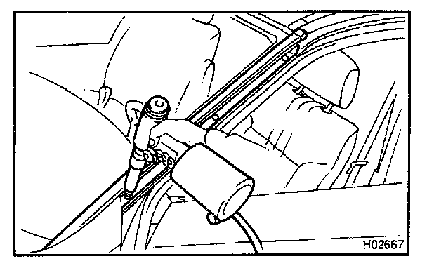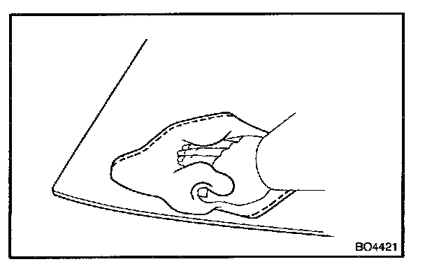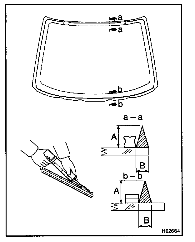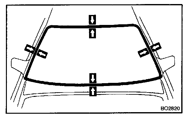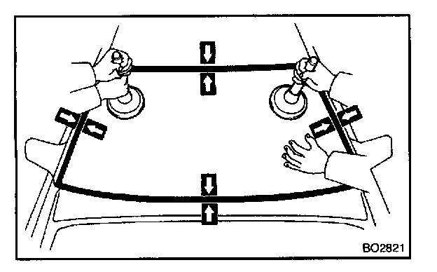 NOTE: When separating the glass, take care not to damage the paint and interior and exterior ornaments. To prevent scratching the safety pad when removing the windshield, place a plastic sheet between the piano wire and safety pad.