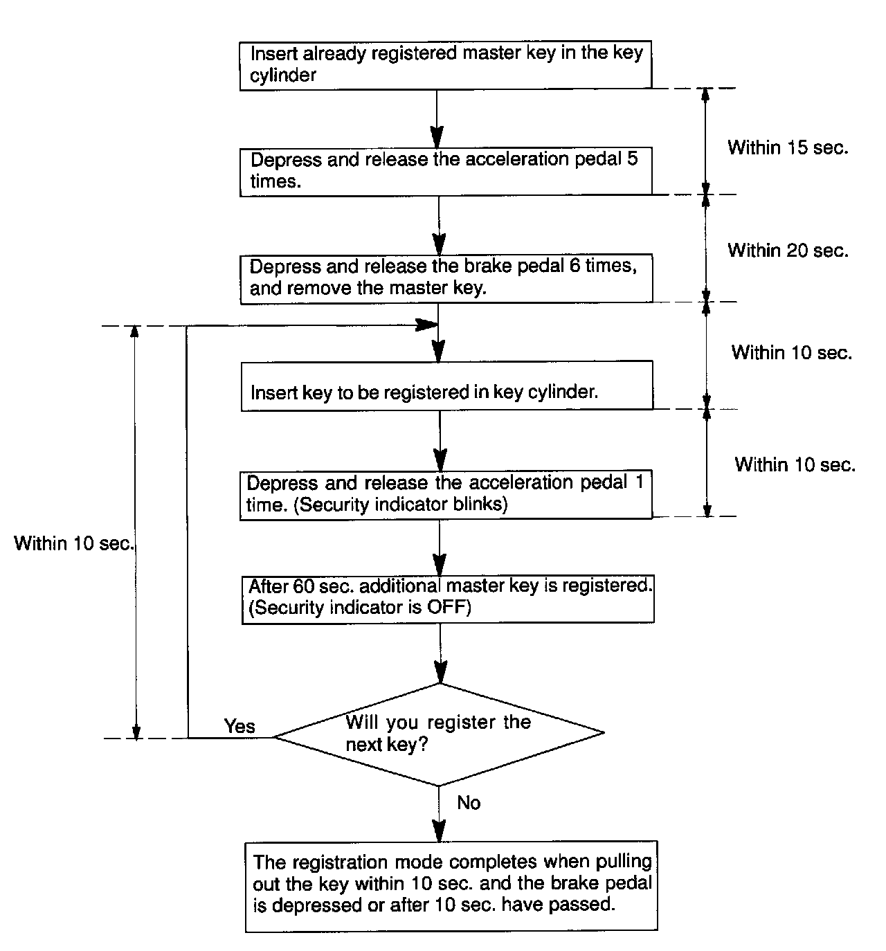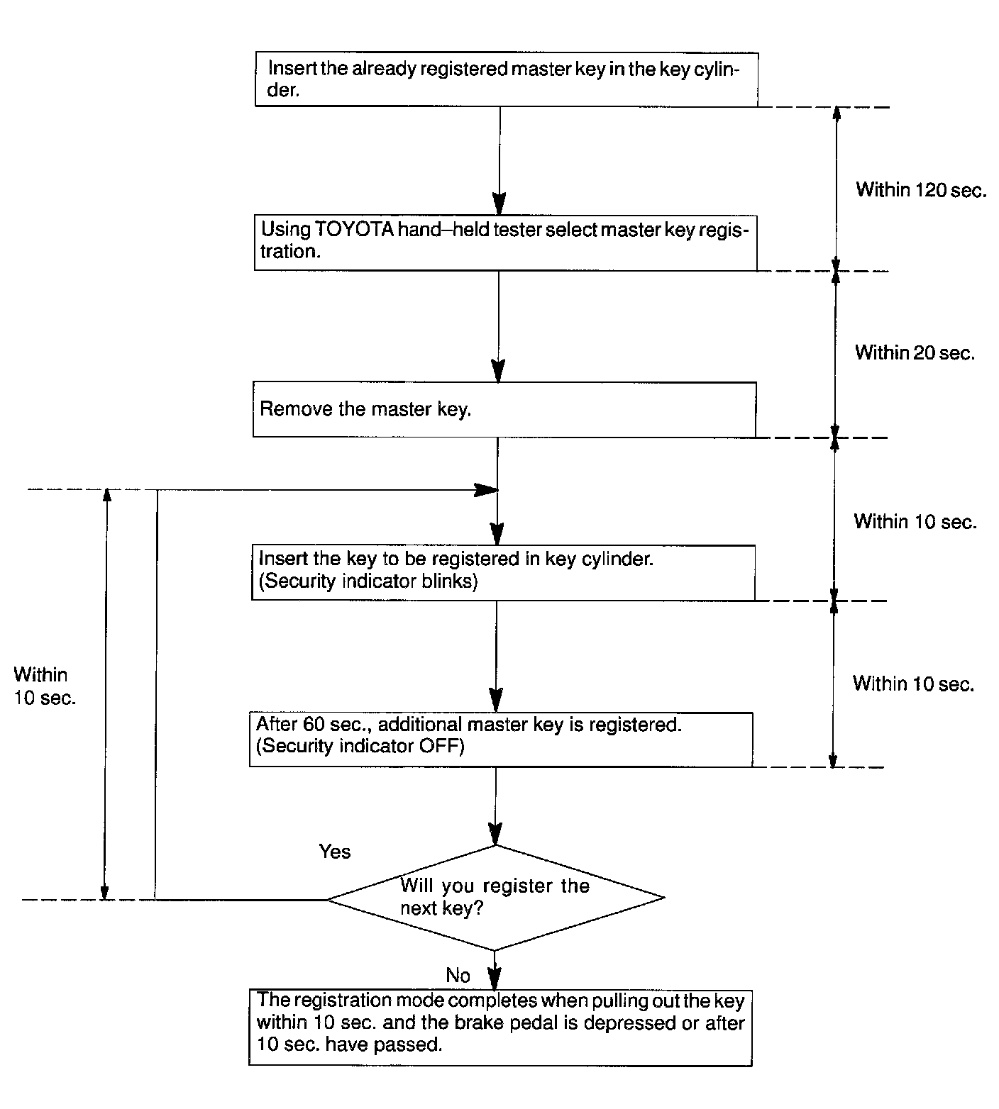 There are 2 ways for registration of additional master key, one is depressing brake pedal and acceleration pedal and the other is using TOYOTA hand-held tester.