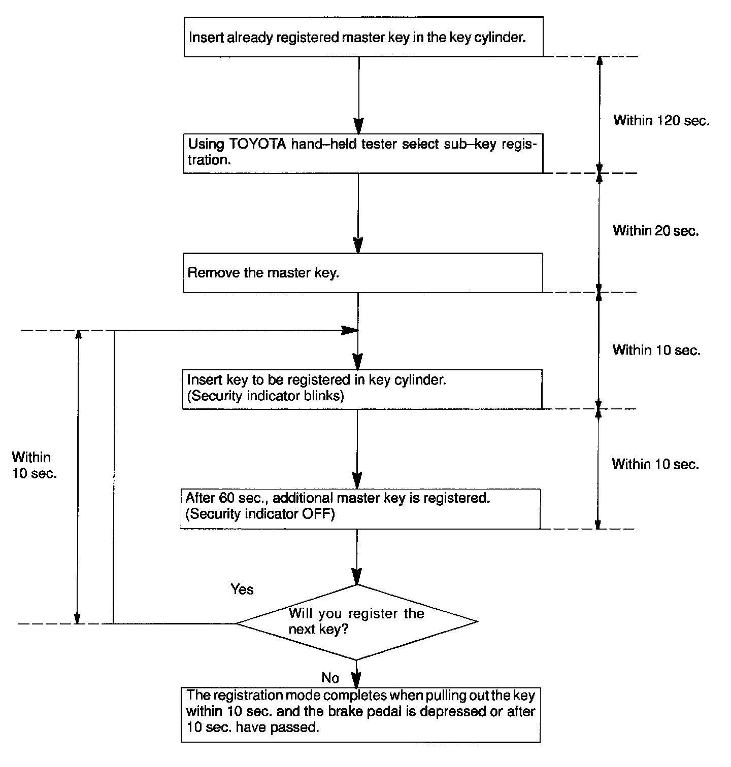 There are 2 ways for registration of additional sub-Key, one is depressing brake pedal and acceleration pedal and the other is using TOYOTA hand-held tester.