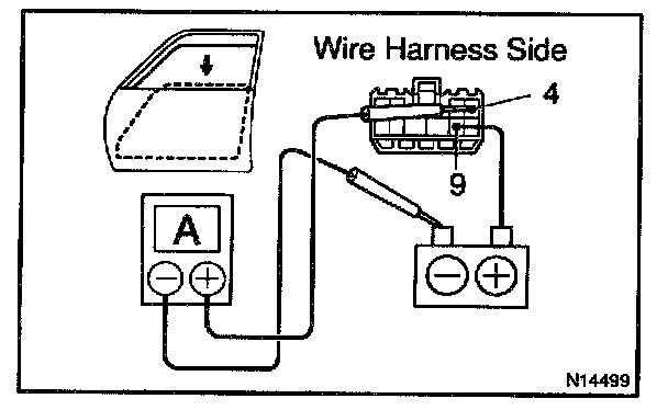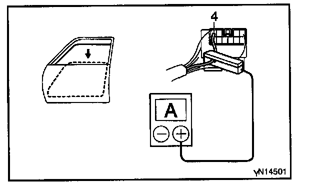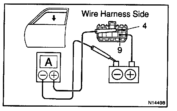 b. Connect the positive (+) lead from the ammeter to terminal 4 on the wire harness side connector and the negative (-) lead to negative terminal of the battery.