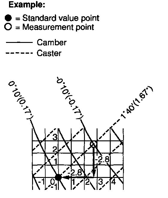 4. As shown in the chart, read the distance from the measured value to the standard value, and adjust the front and/or rear adjusting cams accordingly.