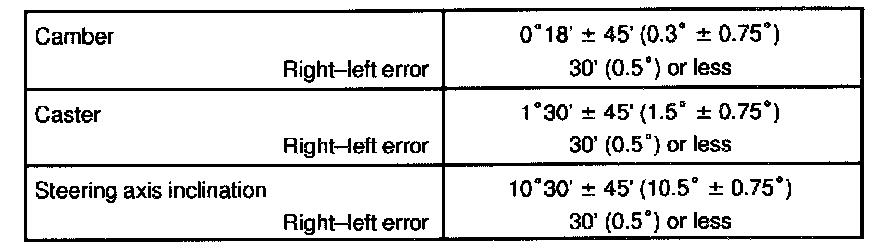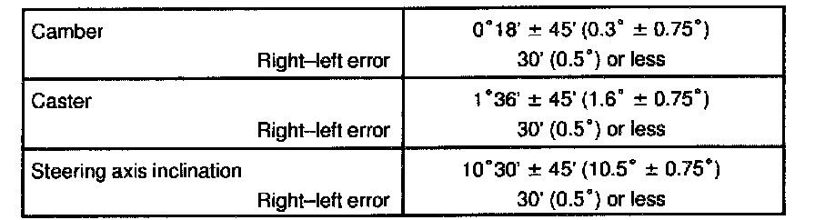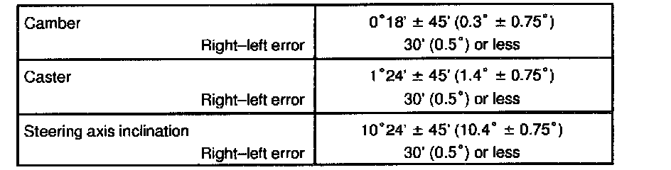 If the steering axis inclination is not within the specified value, after the camber and caster have been correctly adjusted, recheck the steering knuckle and front wheel for bearing or looseness.