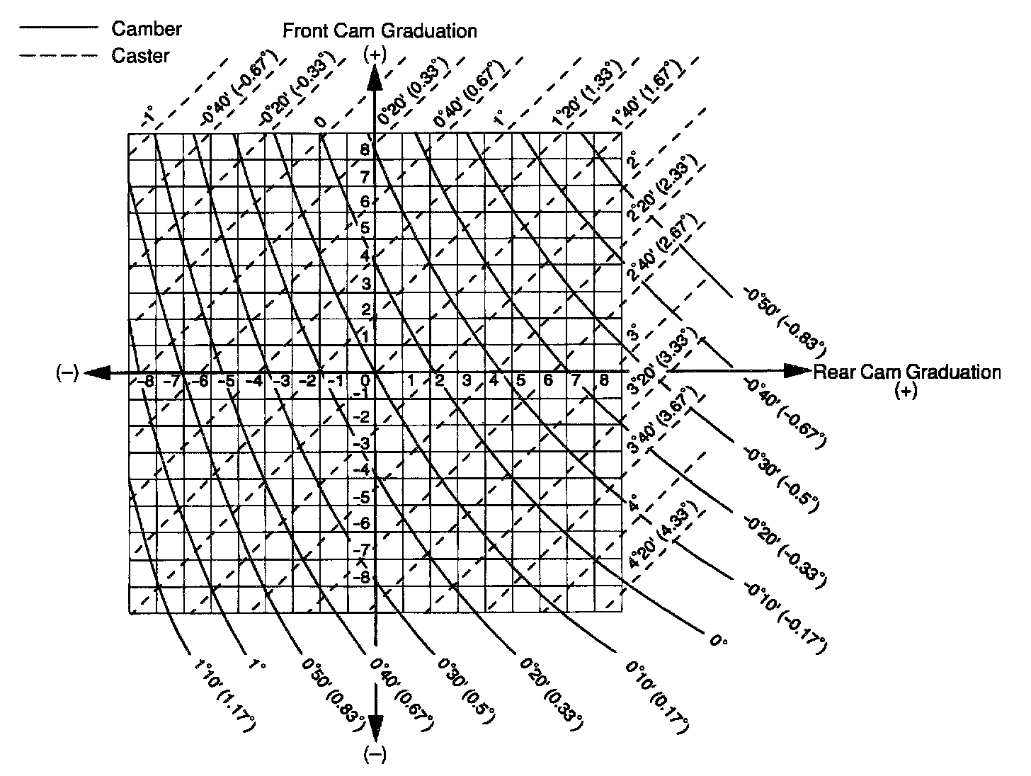 b. Adjust the camber and caster by front and/or rear adjusting cams (See adjustment chart).