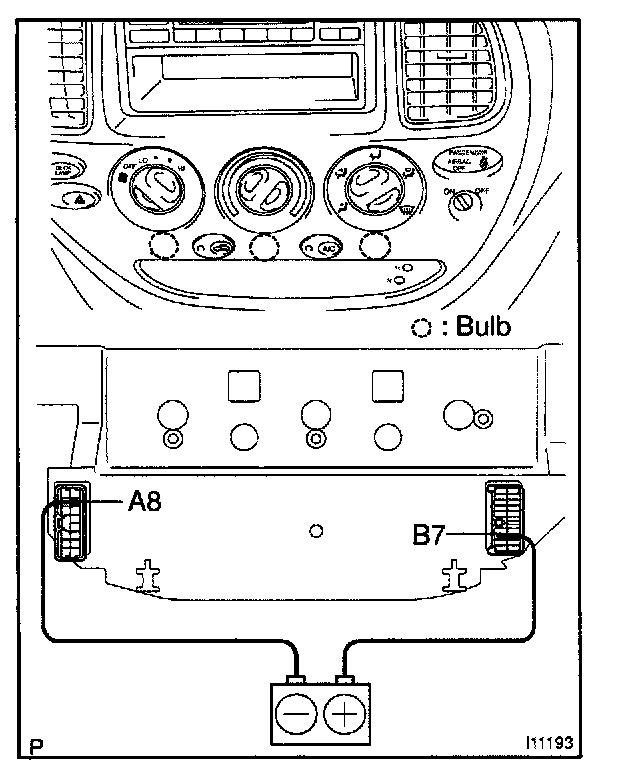 Connect the positive (+) lead from the battery to terminal B7 and negative (-) lead to terminal A8 then check that the illuminations lights up.