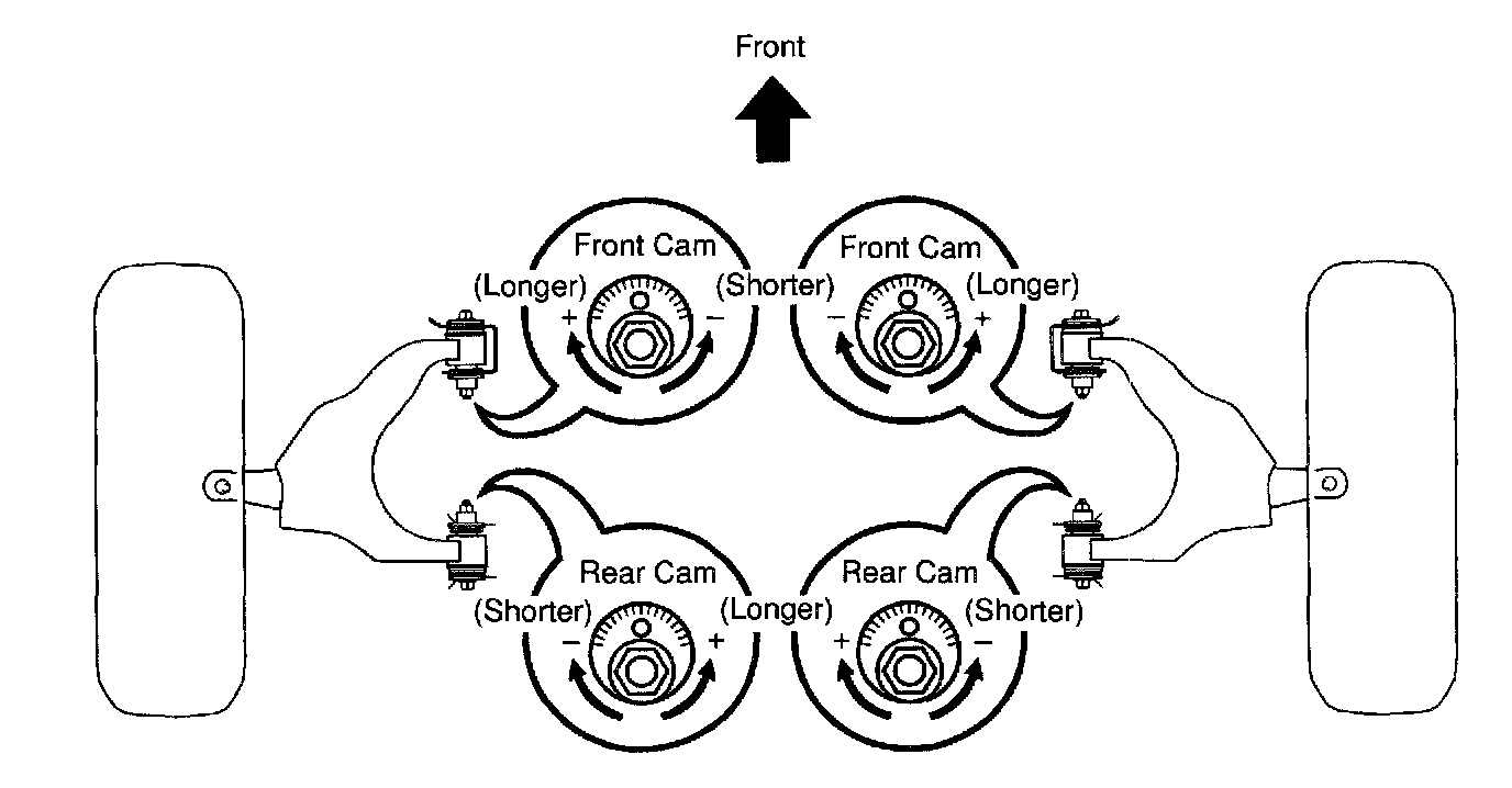 b. Adjust the camber and caster by front and/or rear adjusting cams (See adjustment chart).