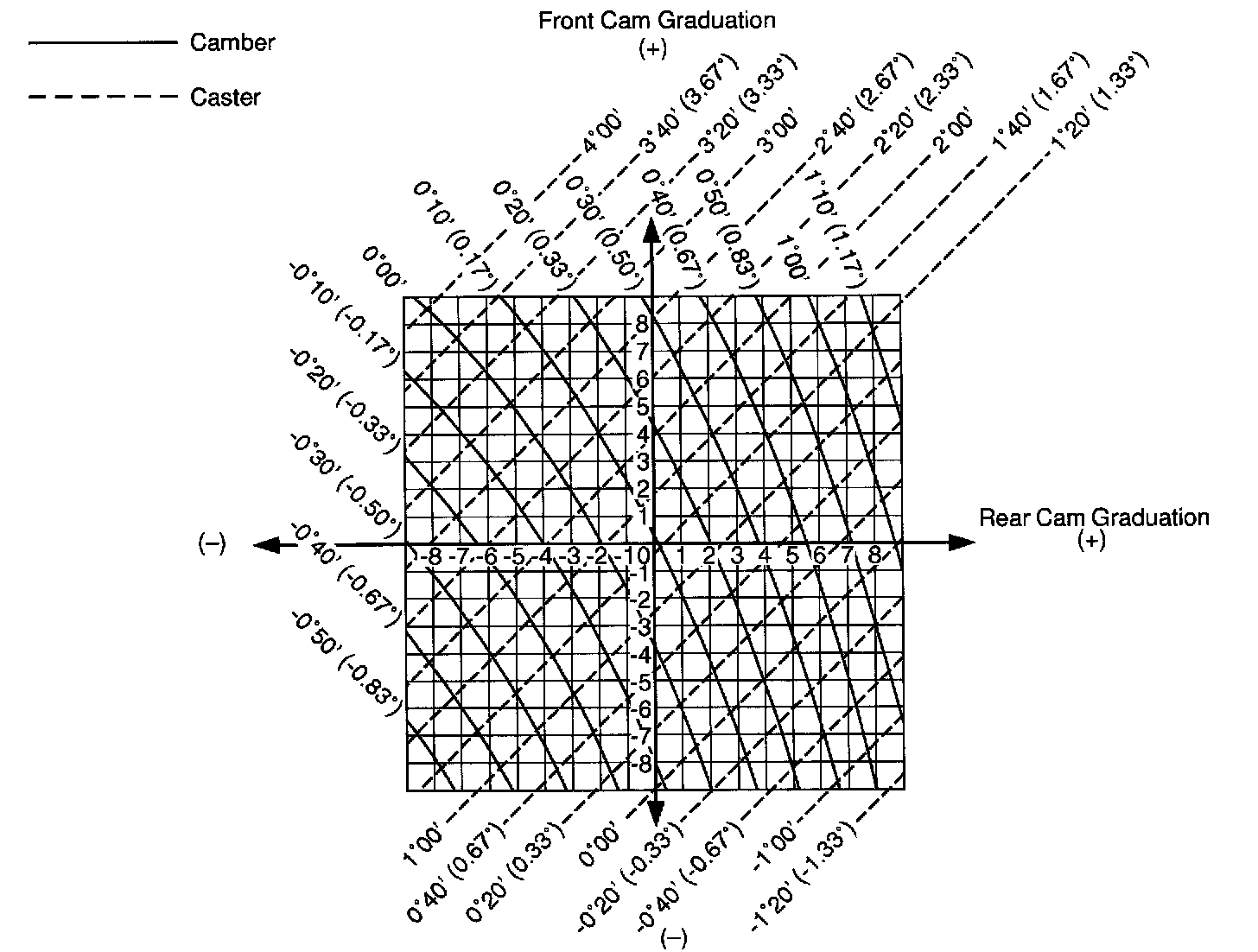5. As shown in the example chart, read the distance from the measured value to the standard value, and adjust the front and/or rear adjusting cams accordingly.