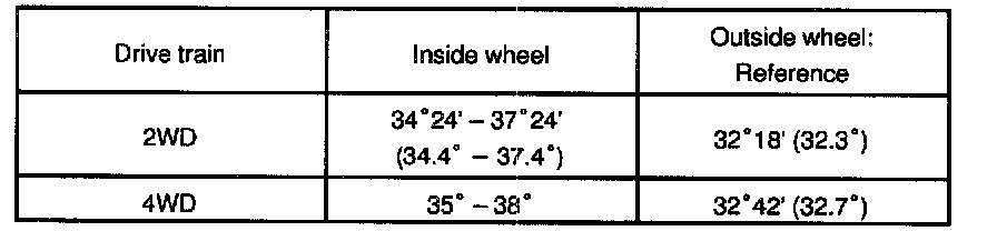 If the right and left wheel turning angles differ from the specified value, readjust the toe-in and wheel angle within the specified value. At this time, make sure that the lengths of the right and left rack ends are the same.