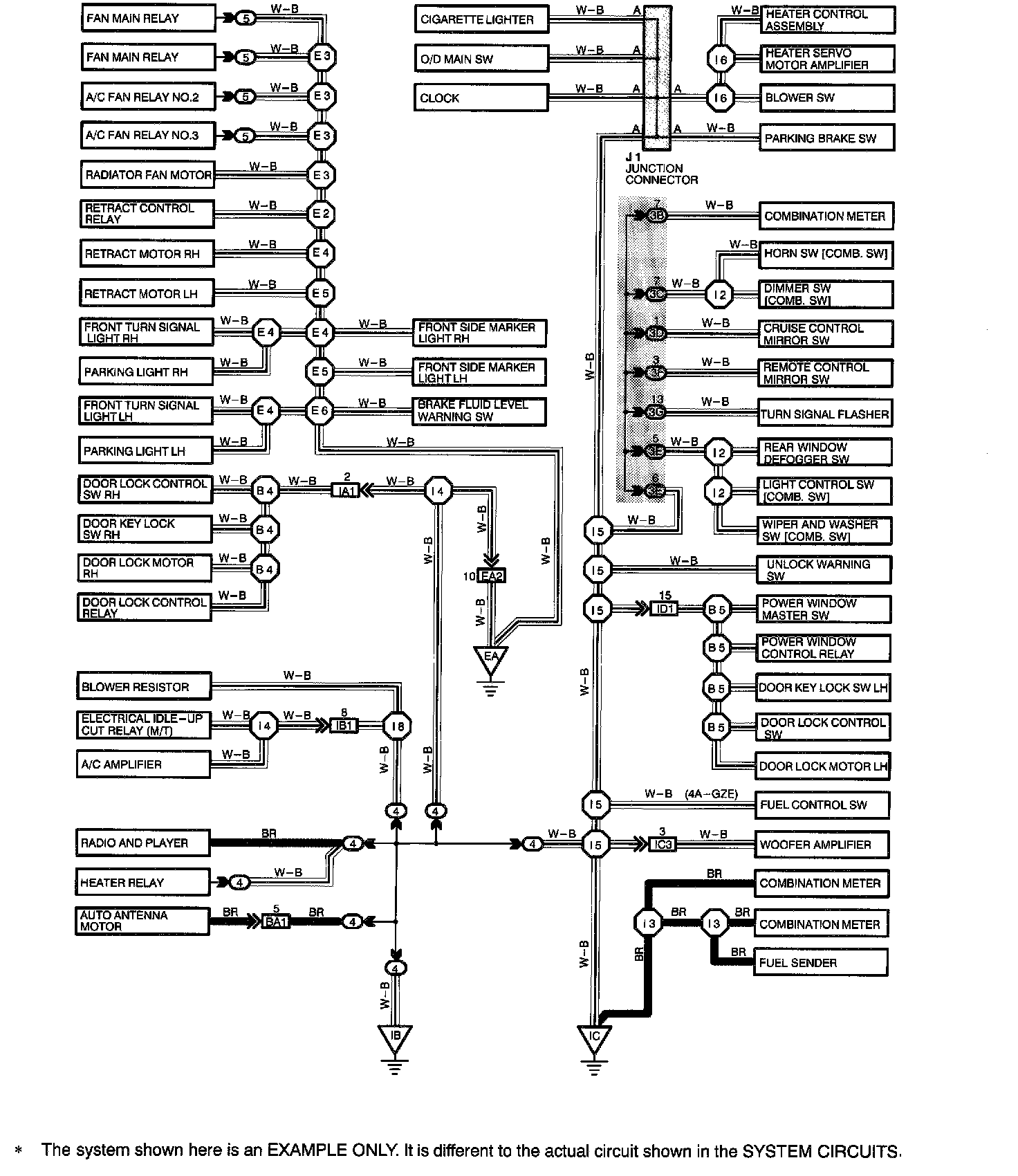The ground points circuit diagram shows the connections from all major parts to the respective ground points. When troubleshooting a faulty ground point, checking the system circuits which use a common ground may help you identify the problem ground quickly. The relationship between ground points ([EA], [IB] and [IC] shown below) can also be checked this way.
