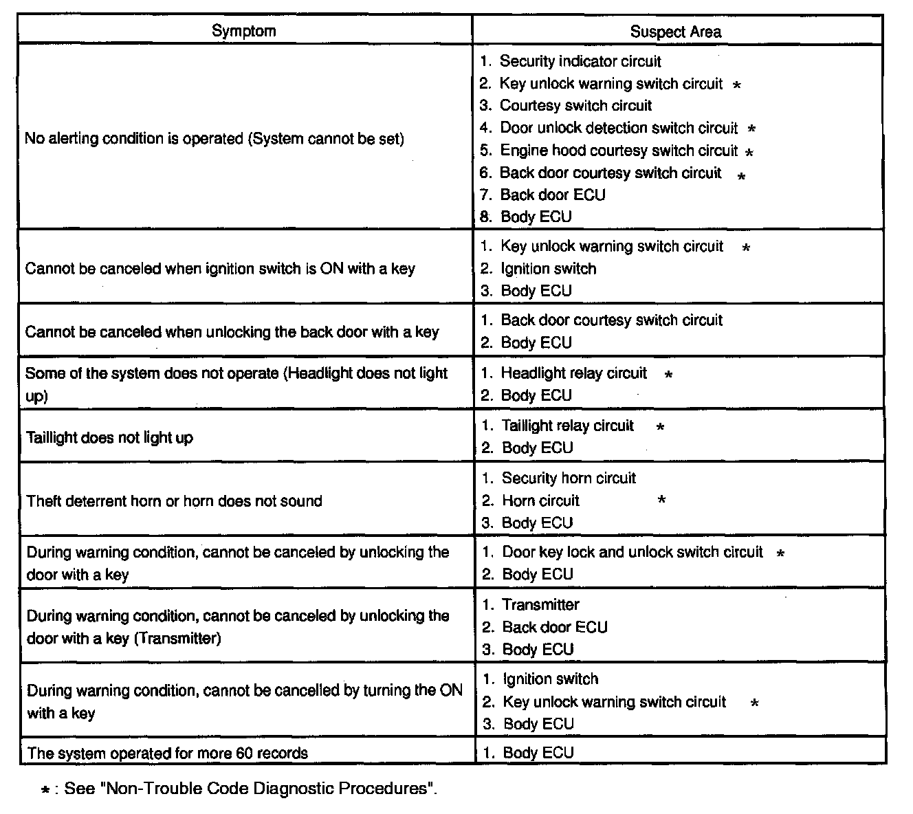 Problem Symptoms Table - Theft Deterrent System: