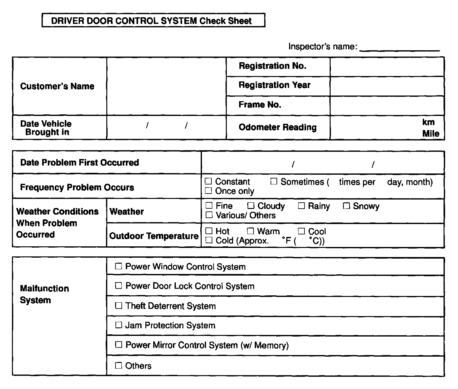 Driver Door Control System Check Sheet: