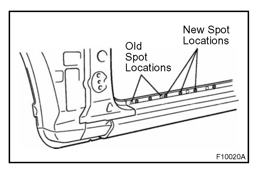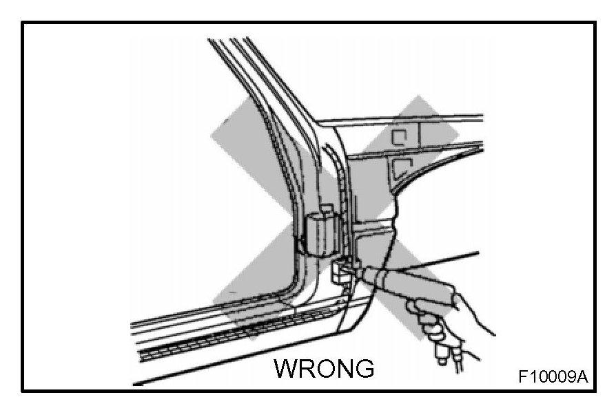 2. Plug welding should be done with a MIG (Metal Inert Gas) welder. Do not gas weld or braze panels at areas other than specified.